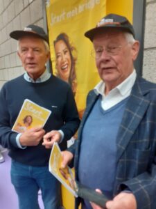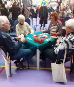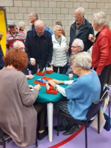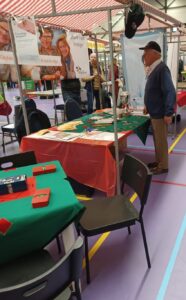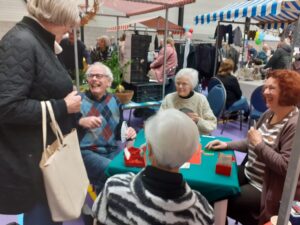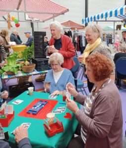 Veel belangstelling voor onze stand met bridgende vrijwilligers.